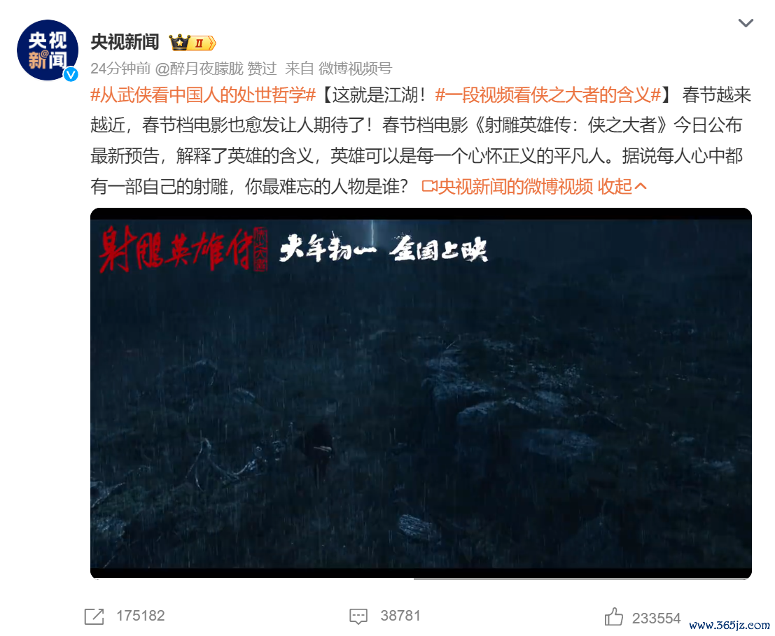 同期,不得不佩服这部电影的排面,春节档上映的大片不少,但像《射雕硬汉传》这样先后取得东谈主民日报和央视新闻宠爱的只此一部。预报片阐述了硬汉的含义:硬汉不错是每一个心胸正义的日常东谈主。