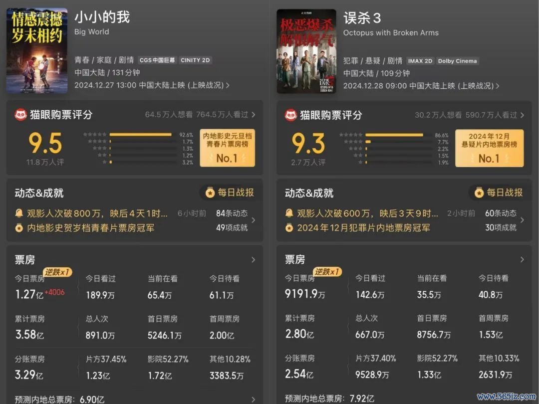 12月27日和28日《小小的我》和《误杀3》接连上映,因预售票房亮眼,一运行阛阓对《小小的我》有着更高的预期,猫眼专科版票房瞻望跳跃7亿,但29日和30日《误杀3》集合两日单日票房跳跃《小小的我》,如今瞻望总票房也高于《小小的我》。同期,《小小的我》豆瓣评分开分后短期内下滑了0.1分,虽是微差,但意味着影片质地是略低于阛阓预期的。