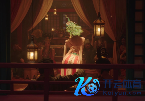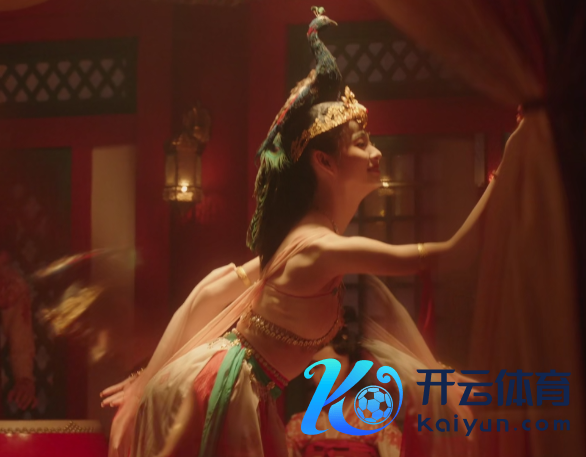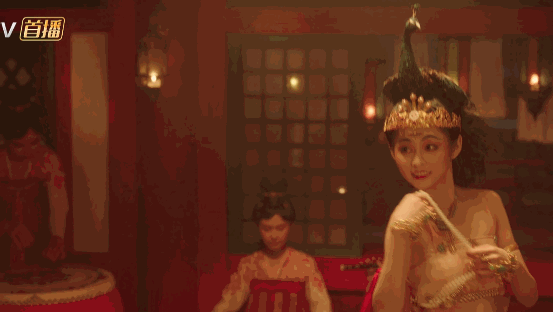 花魁头上的孔雀冠配饰让东谈主咫尺一亮,完好契合了大唐时刻西域的服装特质。