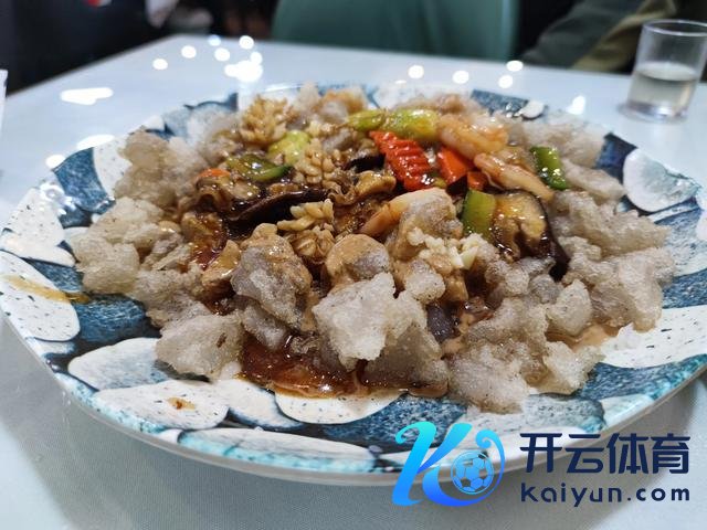 这谈菜是大连海鲜和小吃的完竣研究,焖子即是地瓜淀粉作念的,煎的表皮金黄,然后回锅跟虾仁、扇贝肉和海参炒的,上头还淋上了用芝麻酱和蒜泥调的料汁。