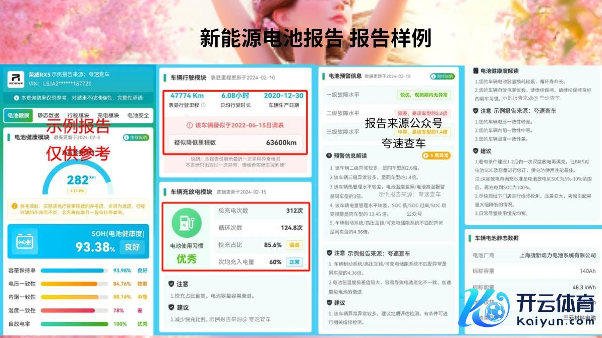 新动力电板论述查询措施:找到公众号“夸速查车”,投入讯息框,点击菜单栏第一列,选拔“新动力电板论述”。凭证页面领导,输入车架号,即可查询。电板论述包含车辆信息、电板信息、电板容量、续航里程、电板评分等多维度信息的分析 。