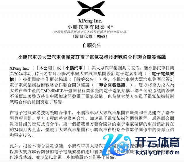 2024 年 2 月,小鹏汽车与大师汽车缔结平台与软件策略技能互助聚积开导条约,两边将聚积开导两款面向中国中型车商场的智能网联车型,首批两款车型已笃定于 2026 年上市,首款家具为 SUV 车型。2024 年 4 月,小鹏汽车与大师汽车集团通知缔结 EEA 电子电气架构技能策略互助框架条约,两边将为大师汽车在中国商场的电动车平台聚积开导电子电气架构;两边聚积开导的 EEA 电子电气架构,展望将从 2026 年起诈欺于在中国出产的大师汽车品牌电动车型。2024 年 7 月,小鹏汽车与大师汽车集团通知缔结电子电气架构技能策略互助聚积开导条约,两边将全力参预为大师在华出产的 CMP 和 MEB 平台开导电子电气架构。