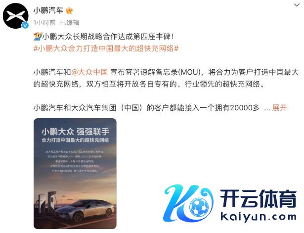 1 月 6 日,小鹏汽车与大师汽车共同通知签署海涵备忘录 ( MOU ) ,两边将共同打造中国最大的超快充汇集。按照斟酌,两边将协力为客户打造中国最大的超快充汇集,两边互相将开放各自独有的、行业起头的超快充汇集,届时国内的充电结尾将进步 2 万个,造成一个隐蔽中国 420 个城市的超快充汇集。