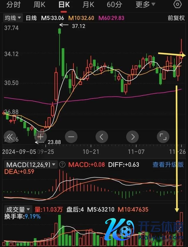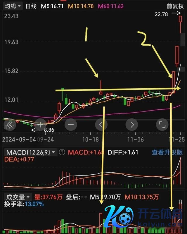 咱们看上头这张图,股价在60均线之上,何况他的启齿并不大,这是适应的。然后咱们再看黄箭头,这是一个阳倍量,然后也打到了前边的平台,何况他的MACD也将近金叉了。