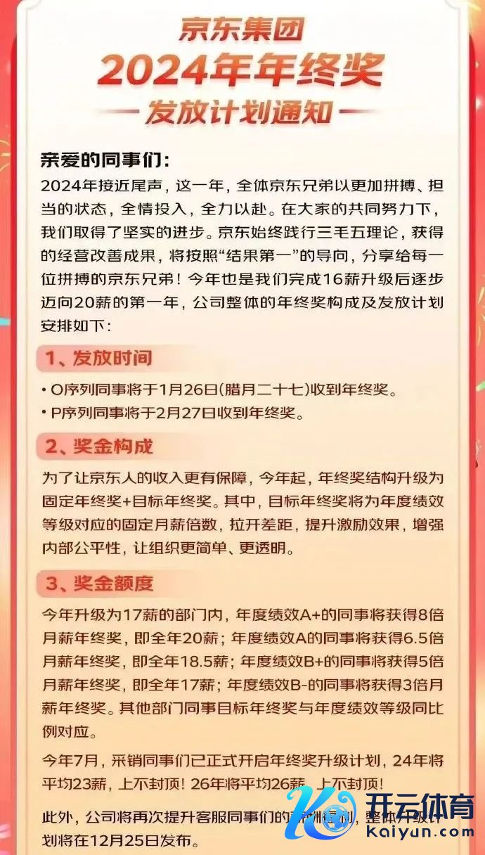 左证见知,京东集团公布的本年年终奖披发时间为:O序列(下层职工,如分拣员、配送员等)共事将于1月26日(腊月二十七)收到年终奖。P序列(专科本事类、模样贬责类)共事将于2月27日收到年终奖。