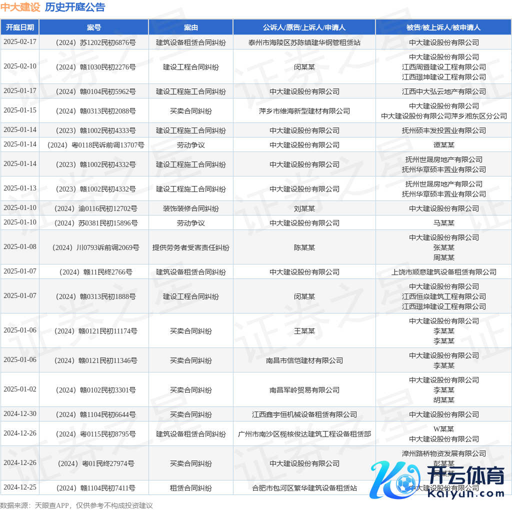案号:(2024)赣0313民初1888号审理法院:萍乡市湘东区东谈主民法院案由:开垦工程协议纠纷当事东谈主信息: 原告/上诉东谈主:闵某某 被告/被上诉东谈主:中打开垦股份有限公司、江西恒焱建筑工程有限公司、江西璟坤开垦工程有限公司开庭日历:2025年1月7日凭证统计,近一年内以中打开垦股份有限公司为当事东谈主的历史开庭公告有261则,其中案由为“生意协议纠纷”的公告以89则居首,其次为“劳务协议纠纷”有50则,“租借协议纠纷”有25则。历史开庭公告(前20条)如下: