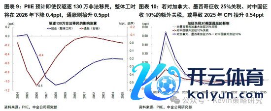 ►什么可能导致错失窗口?特朗普策略的不信托性。特朗普的诸多策略见解齐有很强的通胀性,甚而可能改动咱们上文中提到的通胀旅途。凭证PIIE测算,侨民方面,斥逐130万作恶侨民的情形下,合座工时将在2026年下跌0.4ppt,CPI会较基准水平抬升0.5ppt。关税方面,PIIE测算,若对加拿大、墨西哥征收25%关税、对中国征收10%的荒谬关税,或导致2025年CPI抬升0.54ppt[3]。