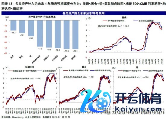 降息空间上,从当然利率和现实利率角度测算,咱们以为好意思联储不错再降息2-3次。降息的实质是把融资资本降至投资讲演率以下,以推动私东谈主信用周期重启,基于这一分析框架,咱们测算基准情形下跌至3.5-3.75%(对应再降2-3次)依然是合适的。面前CME期货预期推测6月和12月各1次。以这个圭臬看,好意思股计入的预期相对合理;好意思债利率预期显著偏少、不错提供短期往还契机;铜价入彀入的降息预期也偏少,因此有上起飞间;黄金短期透支的风险溢价较多。