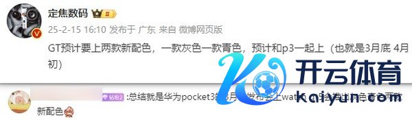 上述博主发文称,华为3月份有一款新形貌小折叠屏手机将推出,外不雅打算很极度,很工致,“让东说念主随机”,价钱还不贵。至于具体是哪款机型,以及打算有啥特色,博主莫得进一步讲明。不外,凭据另外别称博主的爆料,华为在3月傍边将推出的小折叠屏手机即是Pocket 3。同台亮相的还有生腕表——WATCH GT 5,其会推出灰色和青色两款新配色。