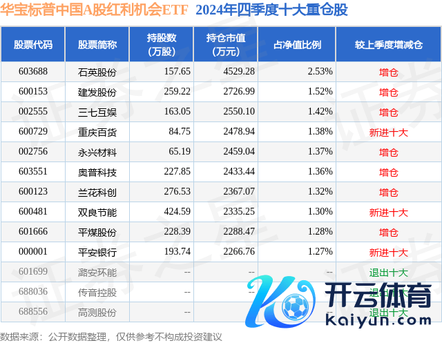 华宝标普中国A股红利契机ETF为指数型-股票基金,笔据最新一期基金季报清晰,该基金金钱建树:股票占净值比98.97%,无债券类金钱,现款占净值比1.13%。基金十大重仓股如下: