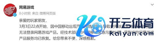 新浪科技讯 3月4日上昼讯息,网易游戏官方回复称:3月3日22点初始,因中国移动出现严重网罗故障,导甚至用该运营商行状的用户无法登录网易游戏家具。经本领部门与中国移动紧要疏通措置,受影响的网易游戏家具行状均已复原。给您带来未便,深感对不起。