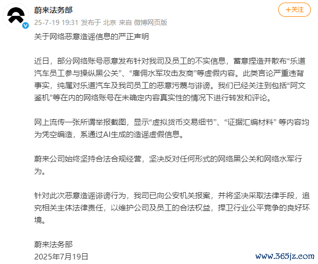 蔚来法务部:有收罗账号坏心发布针对公司及职工的作假信息 公司已向公安机关报案