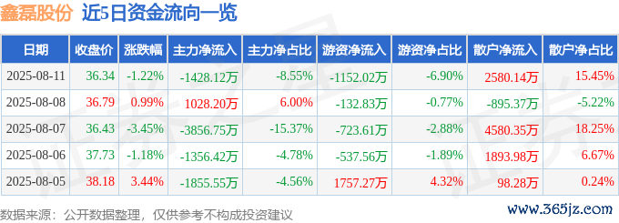 本站讯息,扬弃2025年8月11日收盘,鑫磊股份(301317)报收于36.34元,着落1.22%开云体育,换手率10.23%,成交量4.58万手,成交额1.67亿元。