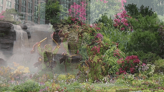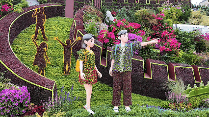 除了“黄河颂歌”花圃,还有许多花圃更换了“新皮肤”。比如, 东单东北角的花圃主题从“擎天玉柱”改换为“色泽经由”,主景仍保留着延安浮屠山,但南泥湾、军民开发等小景不见了,造成了教化带着孩子们在田间研学。