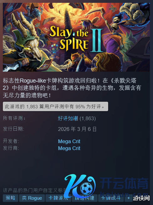Roguelike卡牌构筑游戏续作《屠戮尖塔2》本日(3月6日)稳妥登陆Steam平台体育游戏app平台,收尾到发稿时为止,游戏在Steam上的总评价为「好评如潮」,好评率高达95%>>>,赢得了这么的好得益,姆妈再也无用惦念我的学习了!So easy!