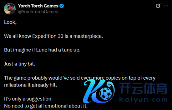 “咱们王人知谈《光与影:33号远征队》是一部神作。但若是给吕涅稍稍调治一下……可能游戏销量还会更进一竿。这仅仅一个提出,毋庸过度解读阵势化。”