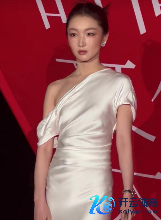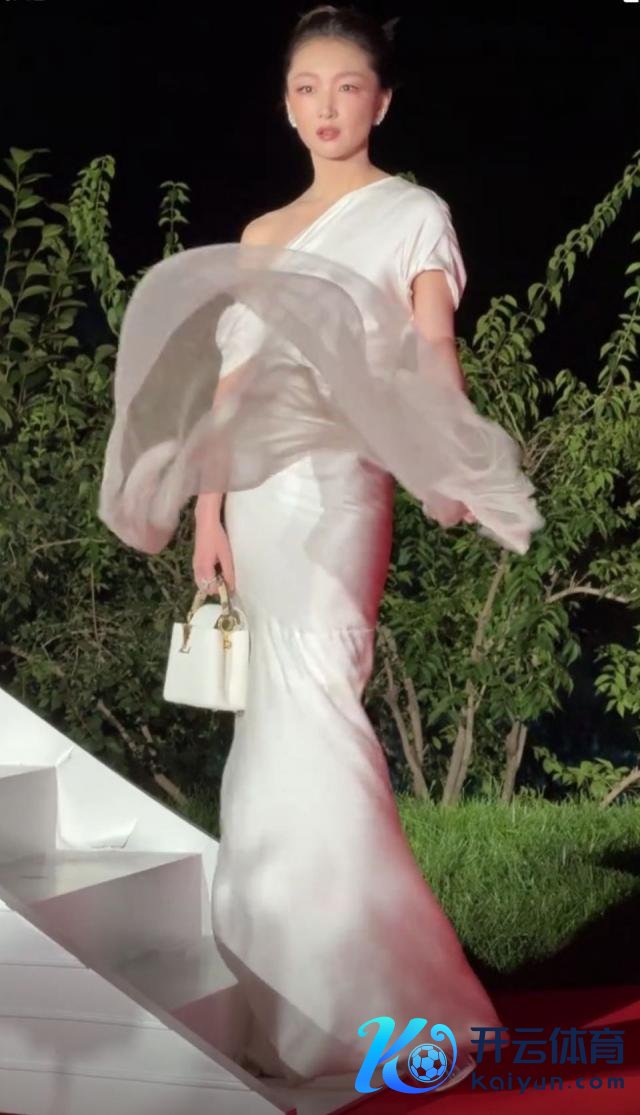 这套斜肩的白色缎面裙装,本就优雅又有质感,搭配清透的白纱,显得周冬雨越发轻微有仙气。