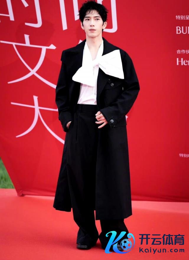 而修罗场男主角井柏然,依旧是前锋凫水儿,大蝴蝶结白衬衣配上玄色阔腿裤、玄色风衣,班师把红毯酿成了秀场。