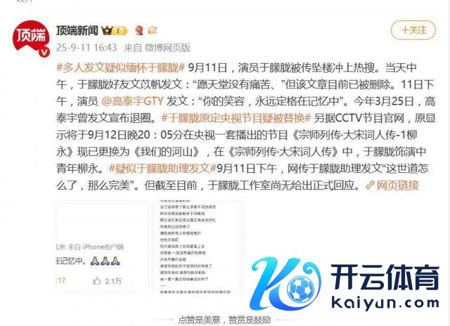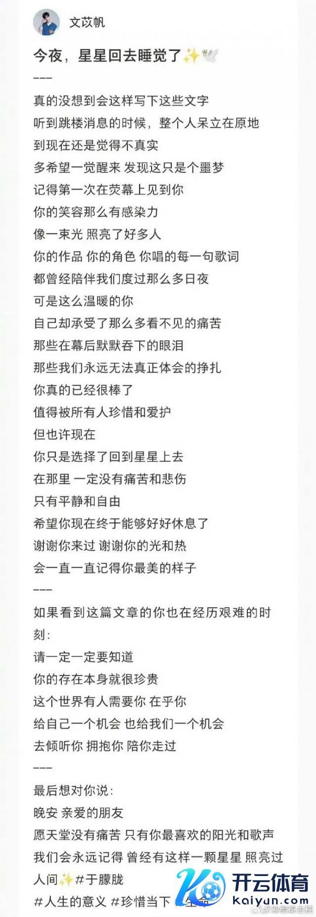 9 月 11 日下昼,文娱圈倏得被一层疑团掩盖。演员文苡帆在 13:49 发布长文吊问于腌臜,文中径直说起"听到跳楼音信时呆立原地",更写说念"愿你回到星星上,哪里莫得厄运",情感悼念、信息量爆炸。但是短短十分钟内,该文就被删除,文苡帆还在挑剔区紧要回报:"我不是官方,和你们相似在等音信,但愿是假的!"——一副"手滑爆错料"后慌忙扶植的方法。