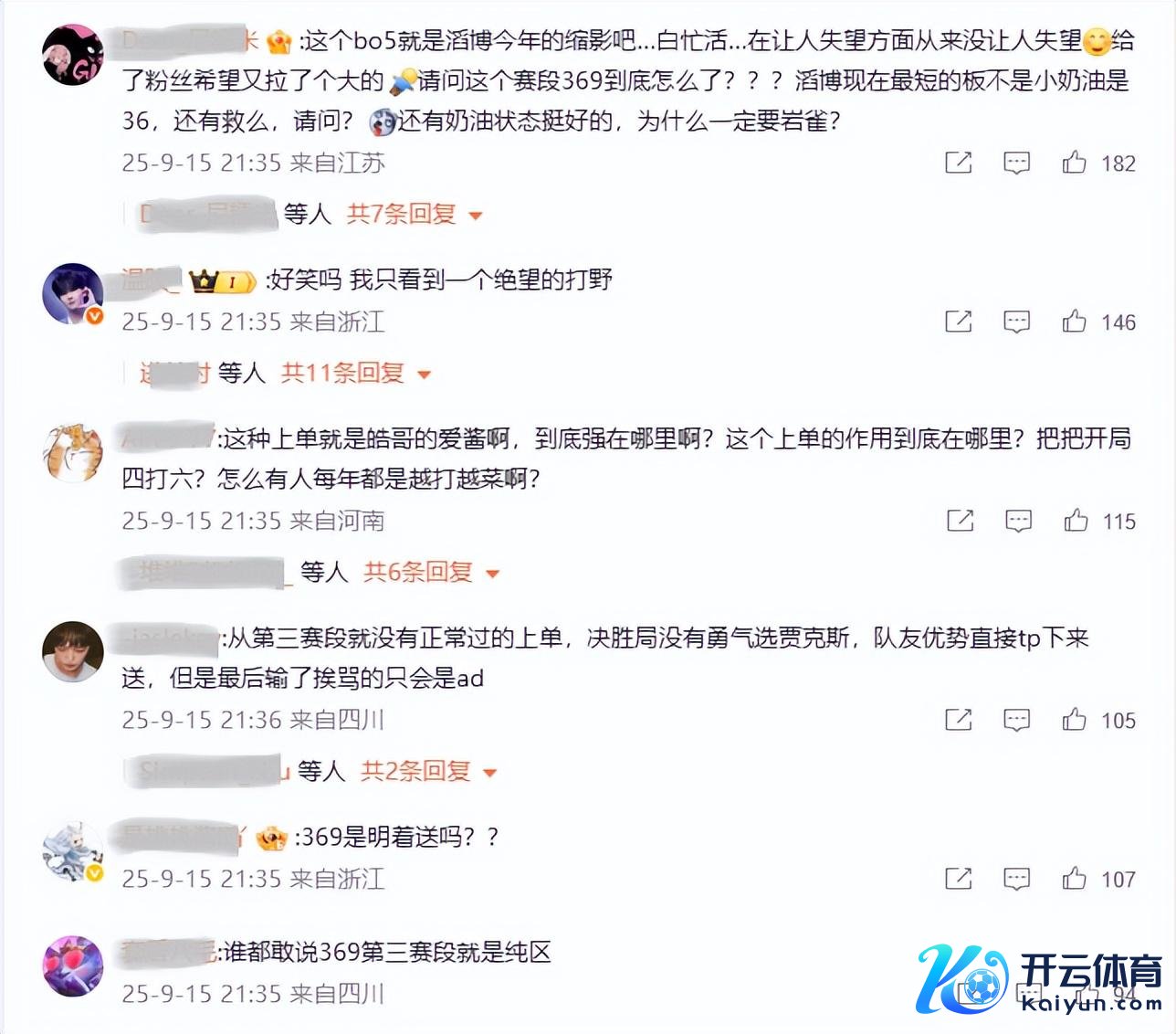 TES官博下方的挑剔如下,被骂得最惨的即是上单369,多数粉丝怒喷369:这个赛段到底怎样了?当今通盘这个词队伍最大的短板即是上单,到底强在那处,为什么司理这样爱369?把把王人是四打六,为什么有东谈主越打越菜?也有粉丝吐槽:Kanavi第五局黯然了,creme也卓越了景况挺好,AD即是输了背锅挨骂的!