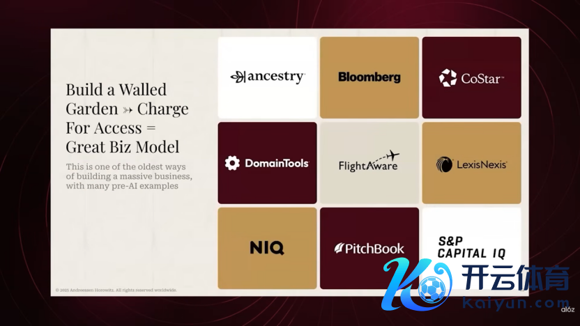 在这种环境下,应用层公司的生计蓝图在于掌持稀缺的原材料——数据。这就像是天下上最迂腐的交易模式:圈一块地,建造实体资产,然后对窥察者收费。在AI时间,你可以通过数据作念相似的事情。