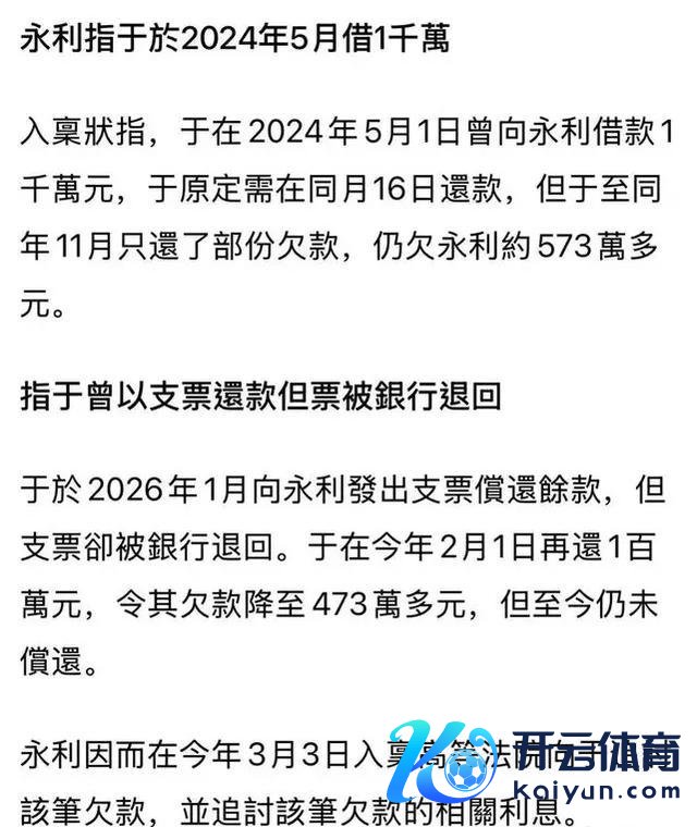 搜狐文娱讯 据港媒报谈,博纳影业集团董事长于冬被澳门永利赌场指欠逾473万元款项未还开云体育(中国)官方网站,赌场向其催讨欠款连利息。永利指出,于冬在2024年5月1日曾向永利借款1000万元,原定需在5月16日还款,但他在同庚11月只还了部份欠款,仍欠永利约573万多元。本年1月,于冬向永利发出支票偿还余款,但支票被银行奉赵,本年2月再还100万元,剩余473万于今仍未偿还。