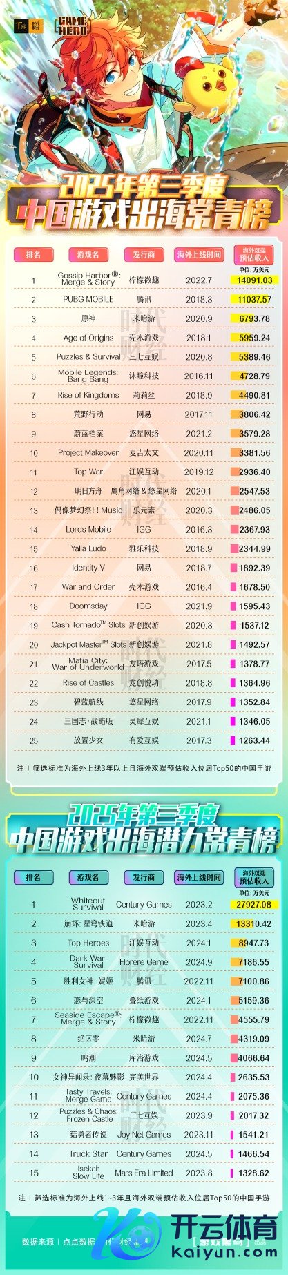 时期财经以国外上线3年以上且国外双端预估收入踏进Top50的中国手游为筛选法度,统计并发布《2025年第三季度中国游戏出海常青榜》(下称“《出海常青榜》”);同期以国外上线1年至3年且国外双端预估收入踏进Top50的中国手游为法度,统计并发布《2025年第三季度中国游戏出海后劲常青榜》(下称“《出海后劲常青榜》”)。