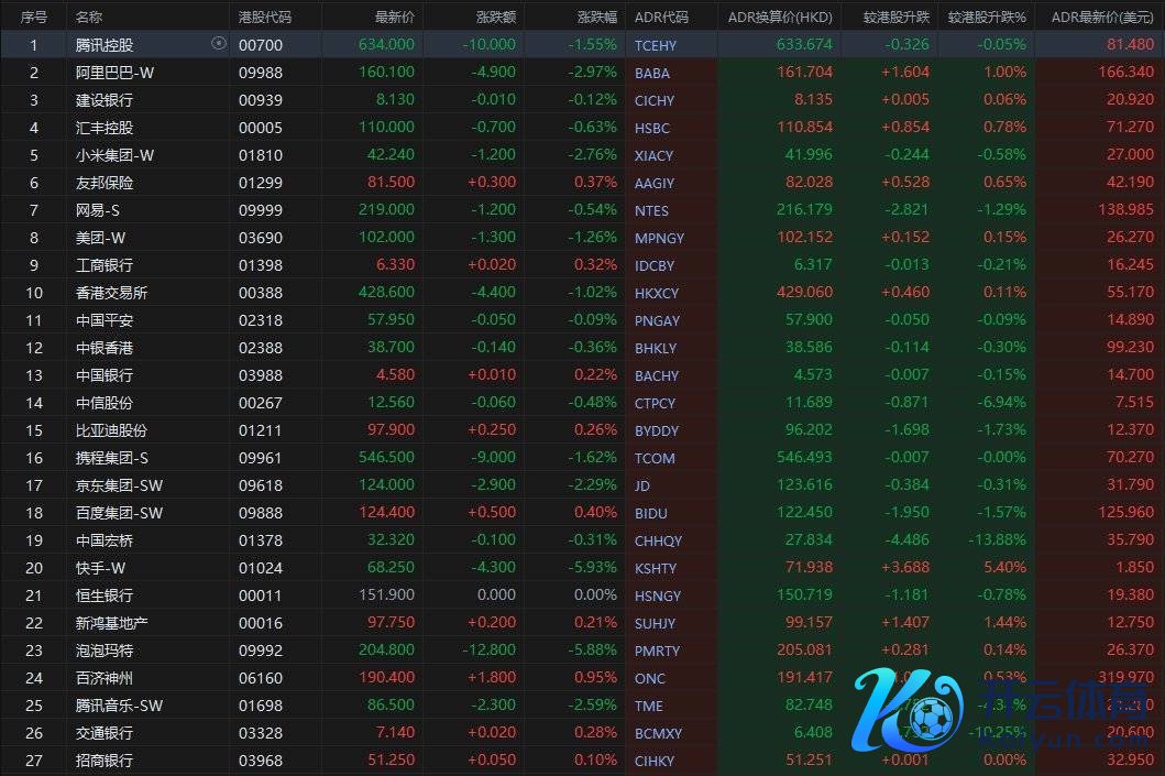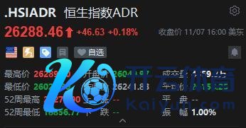 智通财经APP获悉,周五,好意思股三大指数涨跌不一。恒生指数ADR高潮欧洲杯体育,按比例推断,收报26288.46点,较香港收市涨46.63或0.18%。